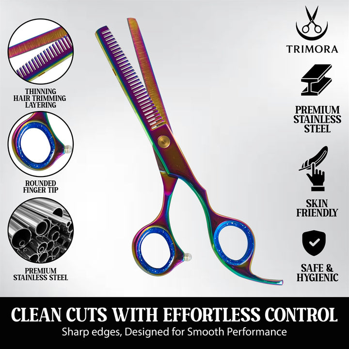 Whether you need straight cutting scissors for clean trims or thinning shears for blending and texturizing, Trimora offers the precision and reliability to achieve flawless results. With ergonomic handles and adjustable tension screws, these tools provide all-day comfort and professional balance.