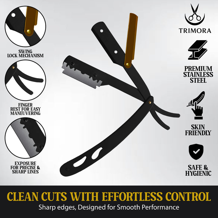 Experience the timeless tradition of a close, clean shave with the Trimora Shaving Razor. Expertly crafted for both professionals and grooming enthusiasts, this razor combines sharp performance, ergonomic design, and premium materials to deliver a barbershop-quality shave at home or in the salon.